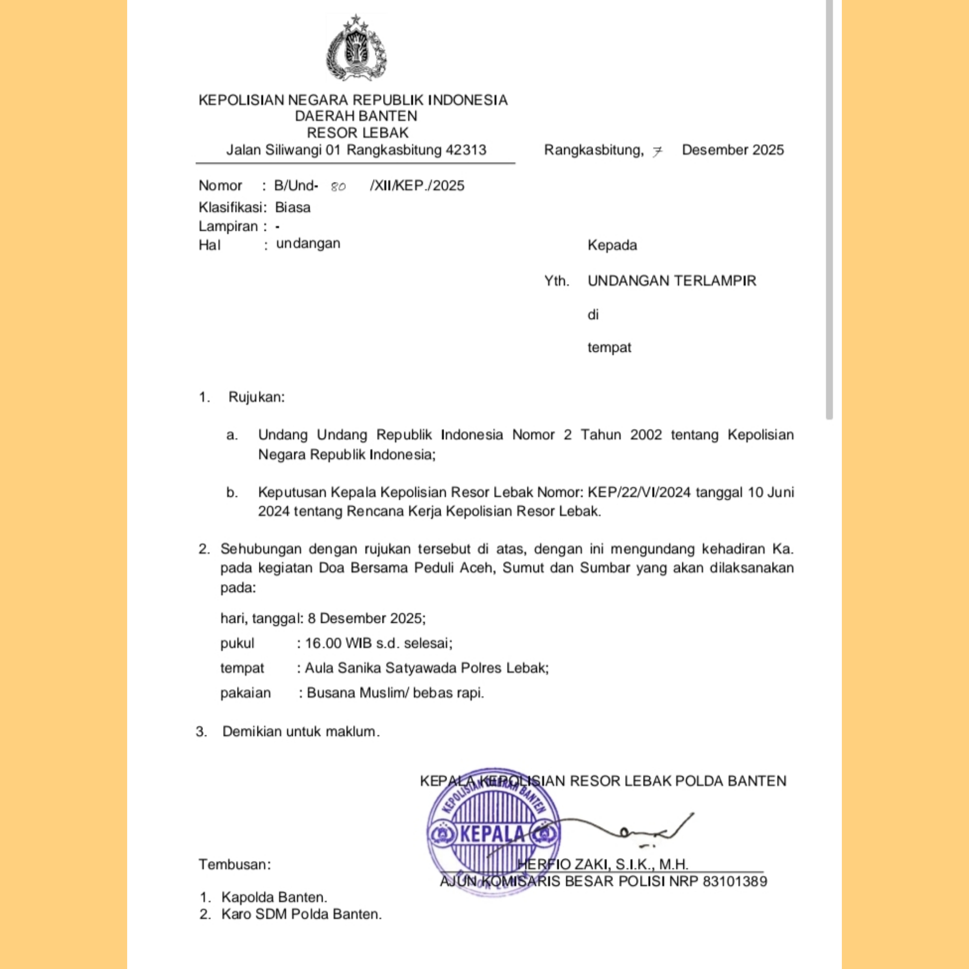 Caption : Surat Undangan Do’a Bersama Polres Lebak