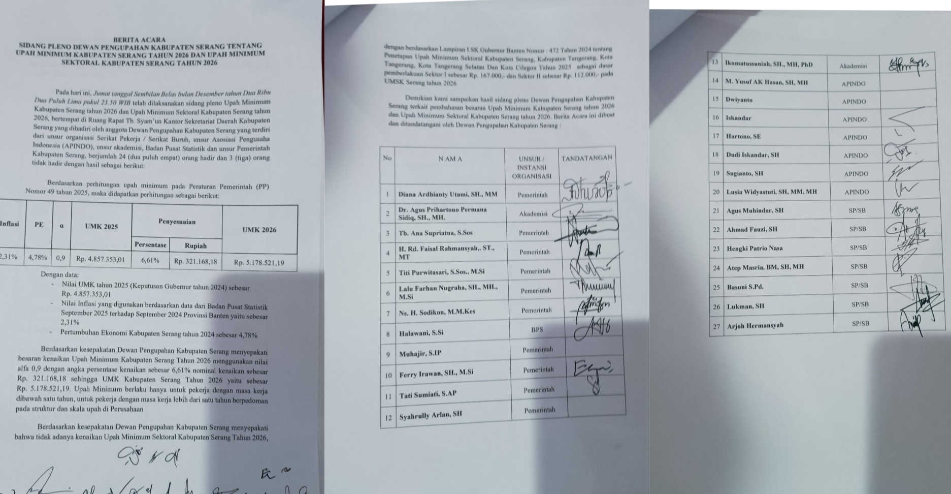 Keputusan tersebut diambil dalam sidang pleno Dewan Pengupahan Kabupaten Serang yang digelar pada Jumat, 19 Desember 2025, dan dituangkan secara resmi dalam berita acara yang ditandatangani seluruh unsur tripartit.