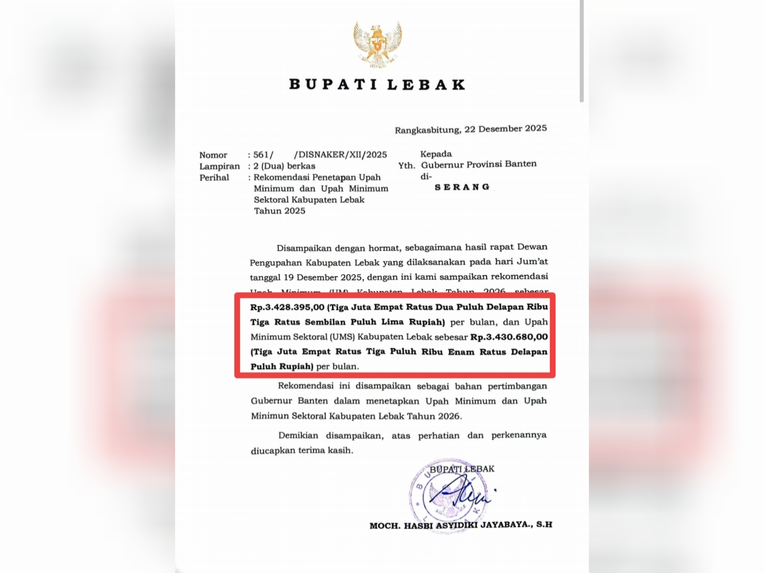 Kenaikan UMK tersebut merupakan hasil rapat Dewan Pengupahan Kabupaten Lebak yang digelar pada Jumat, 19 Desember 2025, dan telah direkomendasikan kepada Gubernur Banten melalui surat resmi Bupati Lebak tertanggal 22 Desember 2025.